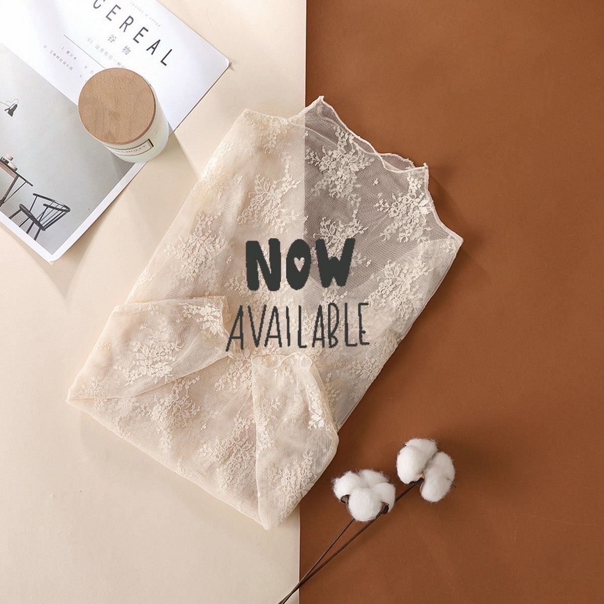 Lace shirt to put inside or outside very delicate Size M Color Cream Fabric: 95% CHINLON, 5% SPANDEX SEMI SHEER MESH LACE SEXY SLIM BOTTOMING SHIRT SIZE: S-M-L-XL 95% CHINLON, 5% SPANDEX