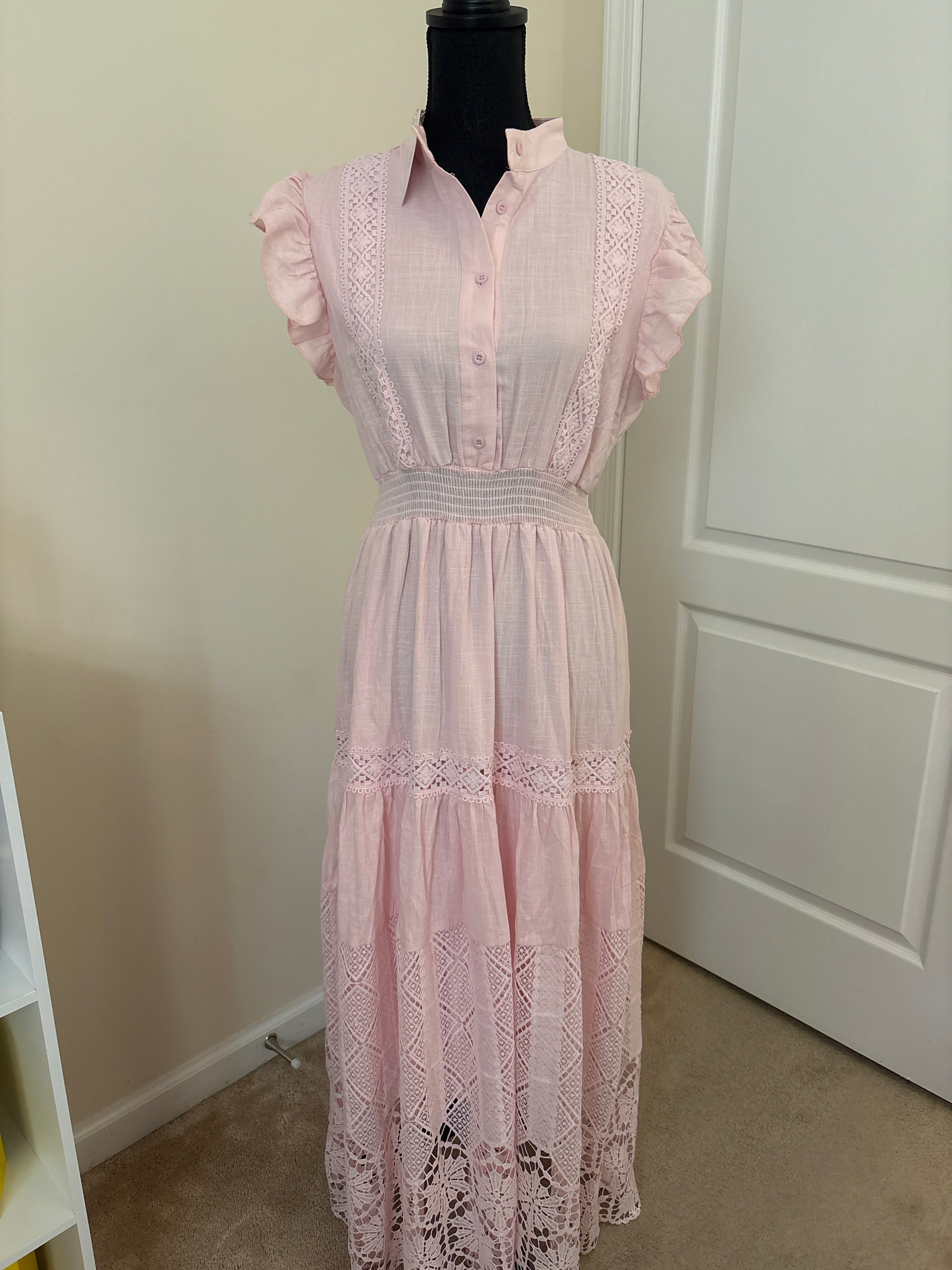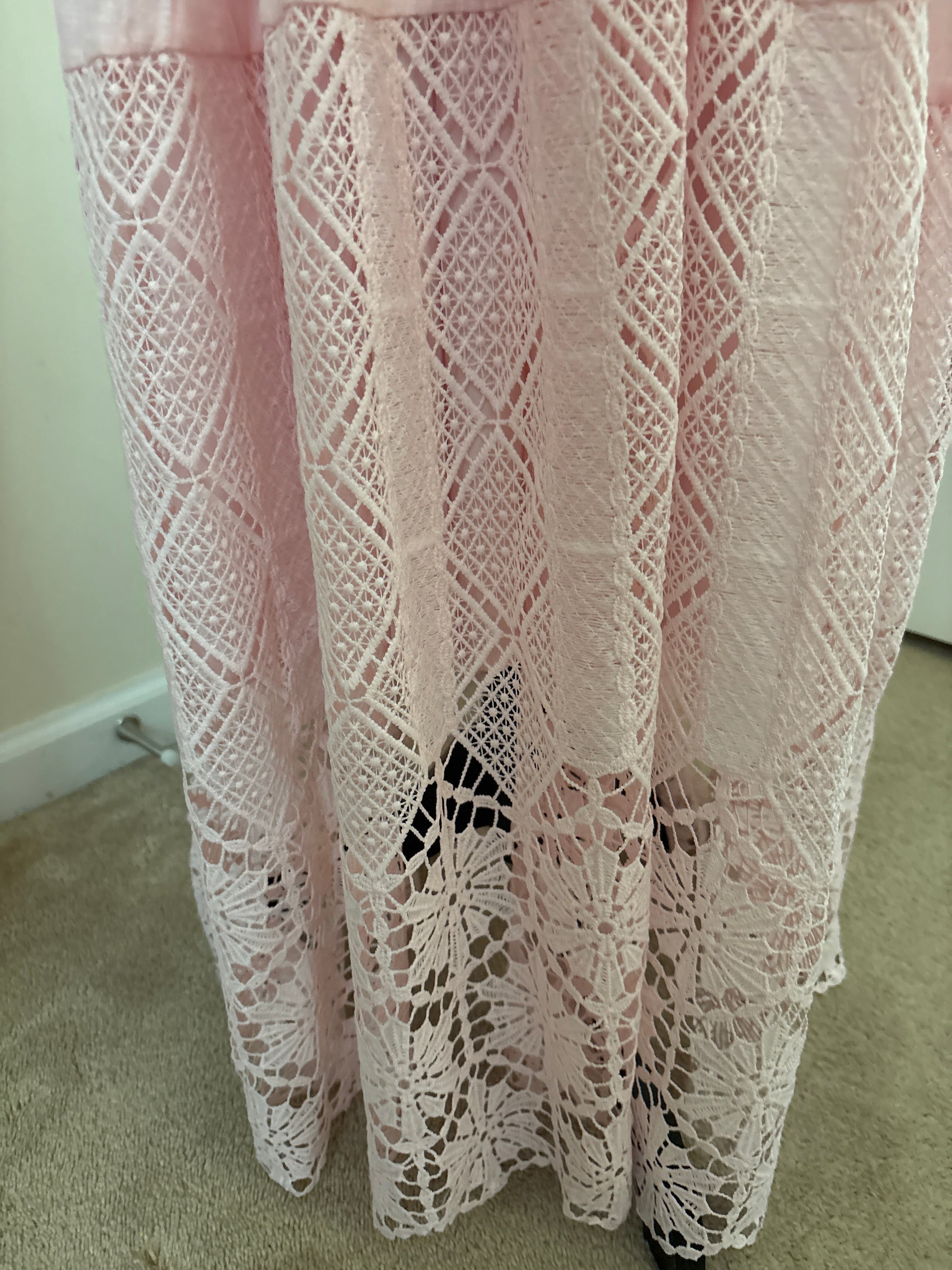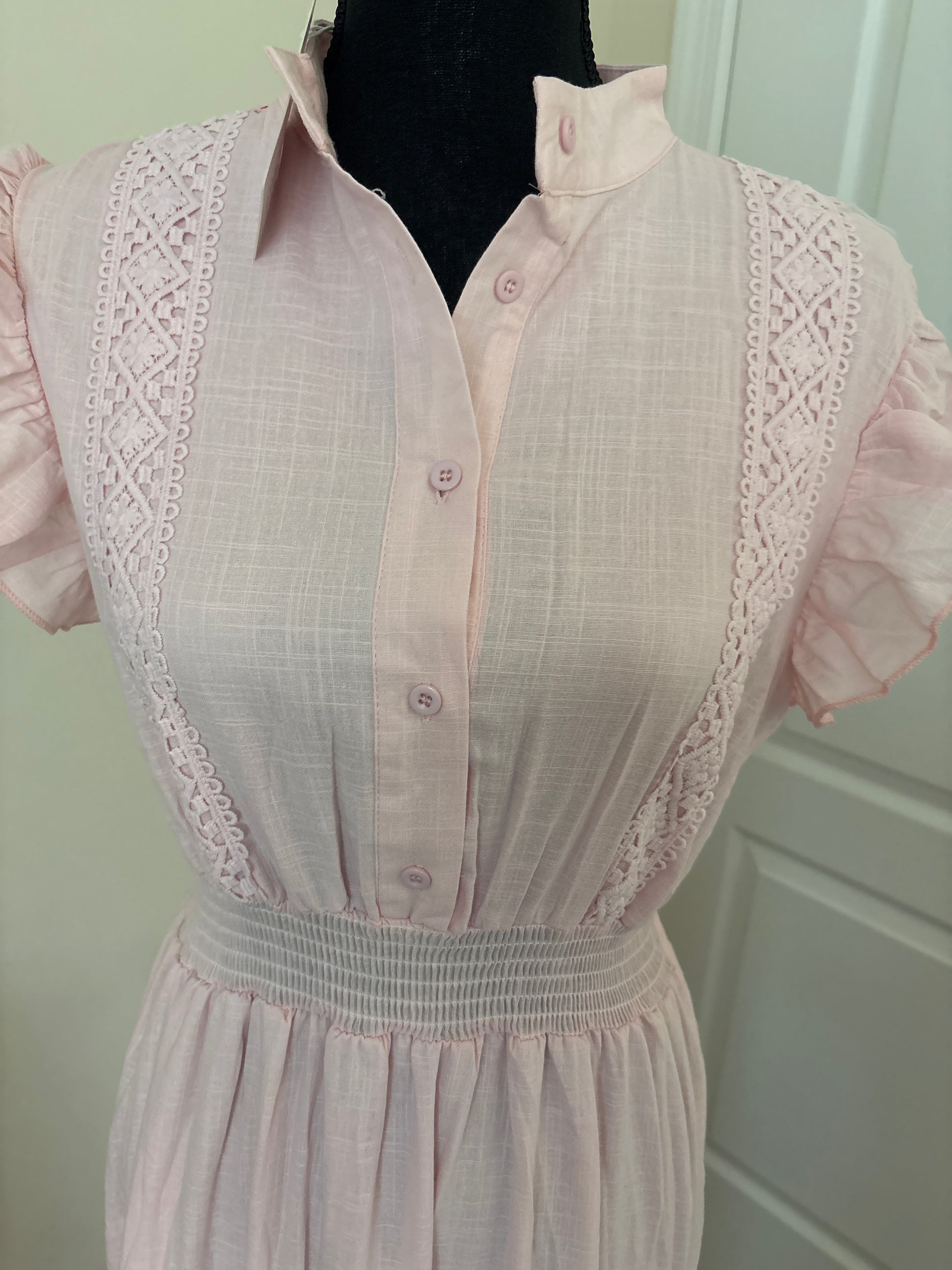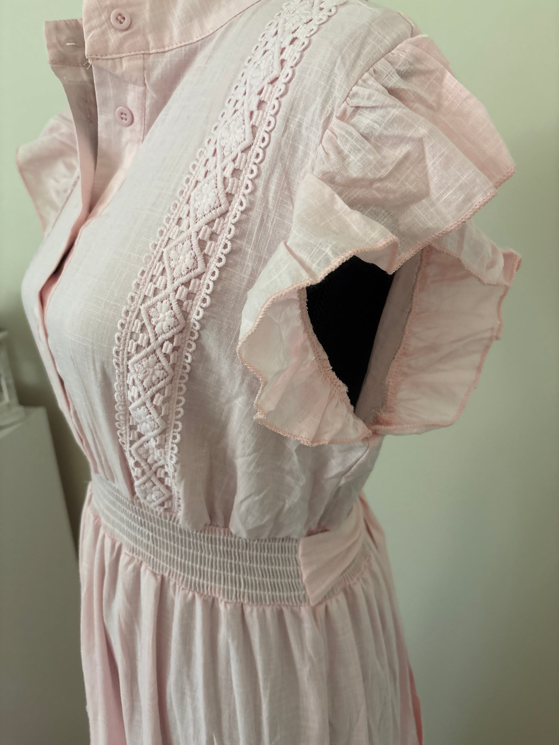 Este precioso vestido en color rosa claro está confeccionado en una mezcla suave de algodón (65%) y poliéster (35%), con encajes bordados que le dan un toque romántico.